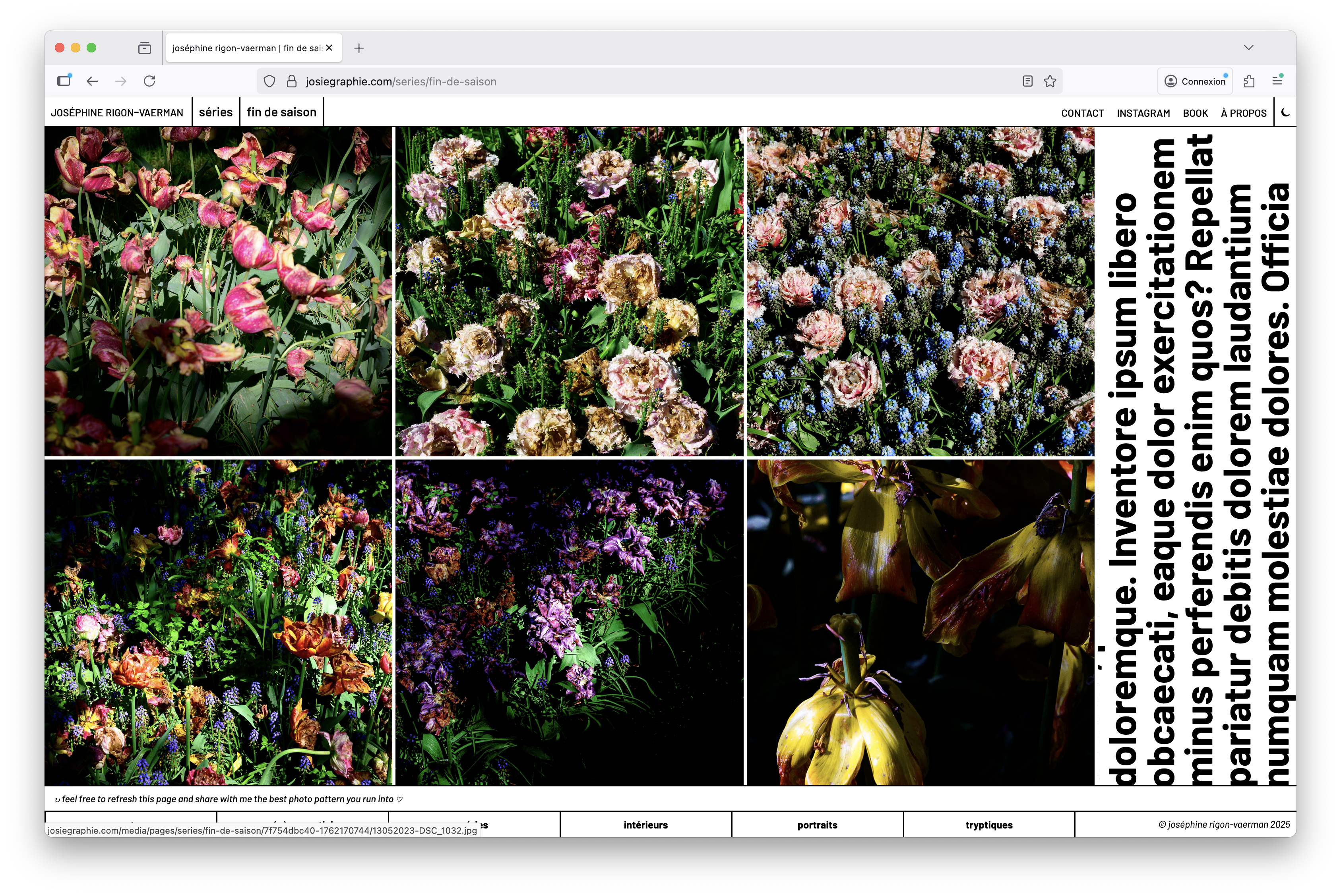 À travers la photographie, je documente des fragments, des matières, des gestes, des traces — tout ce qui compose une cartographie intime du réel. J’aime travailler en séries, faire dialoguer les images, créer des ensembles qui révèlent un langage.