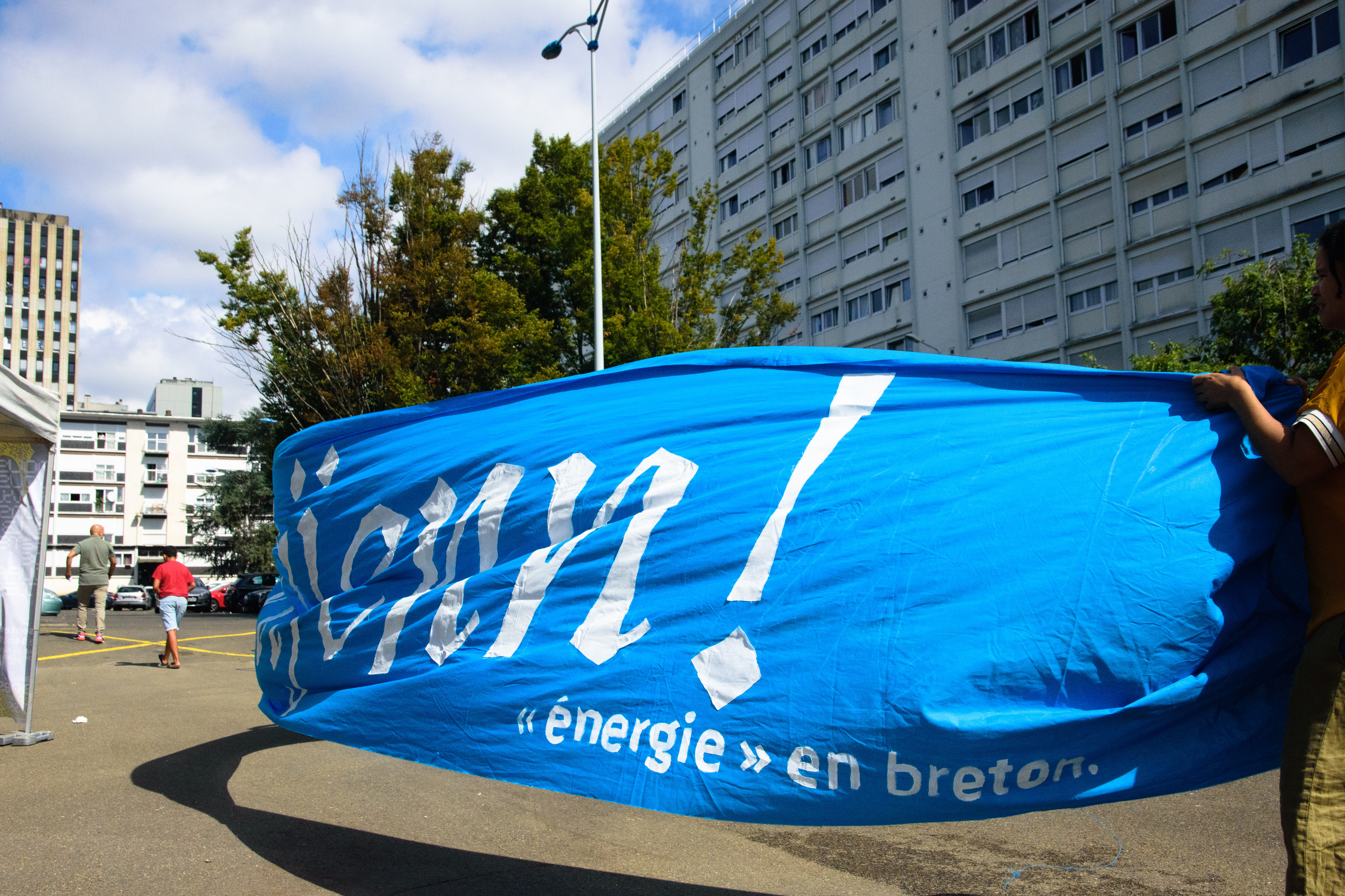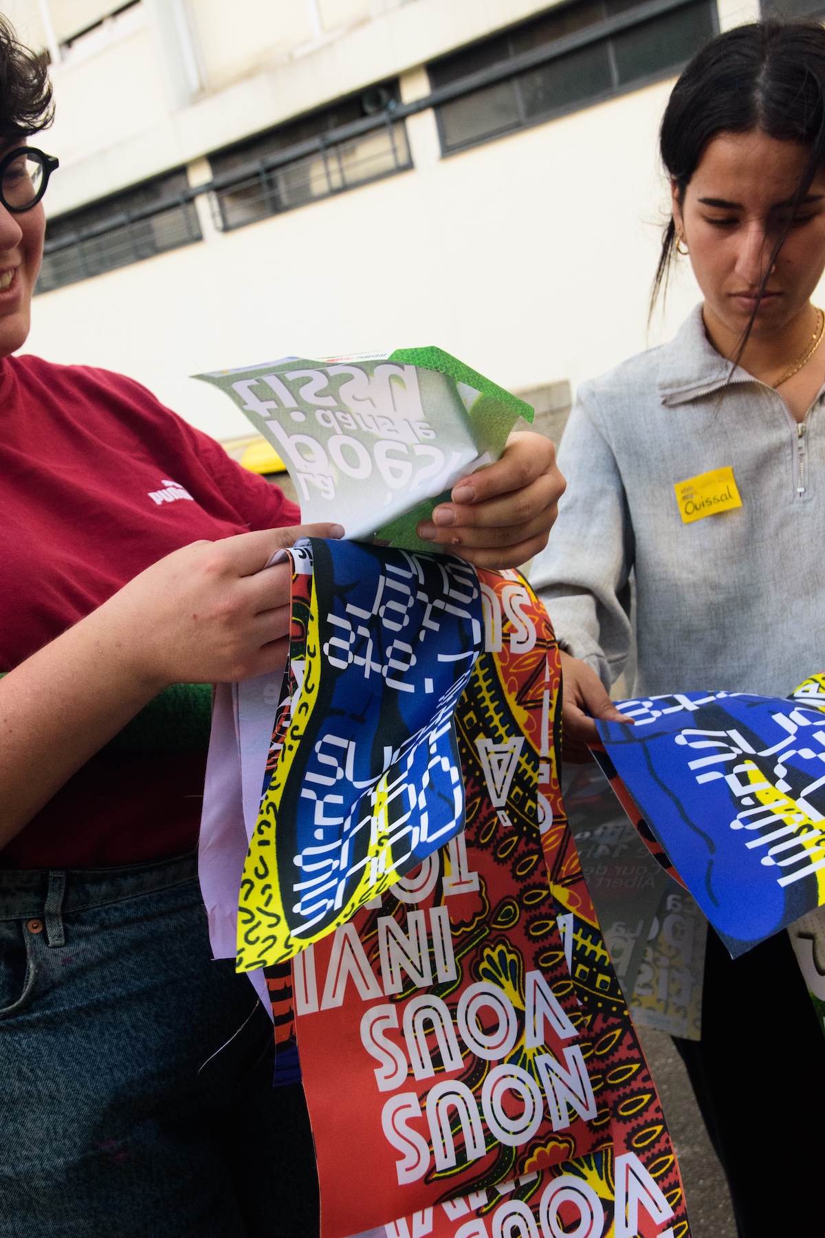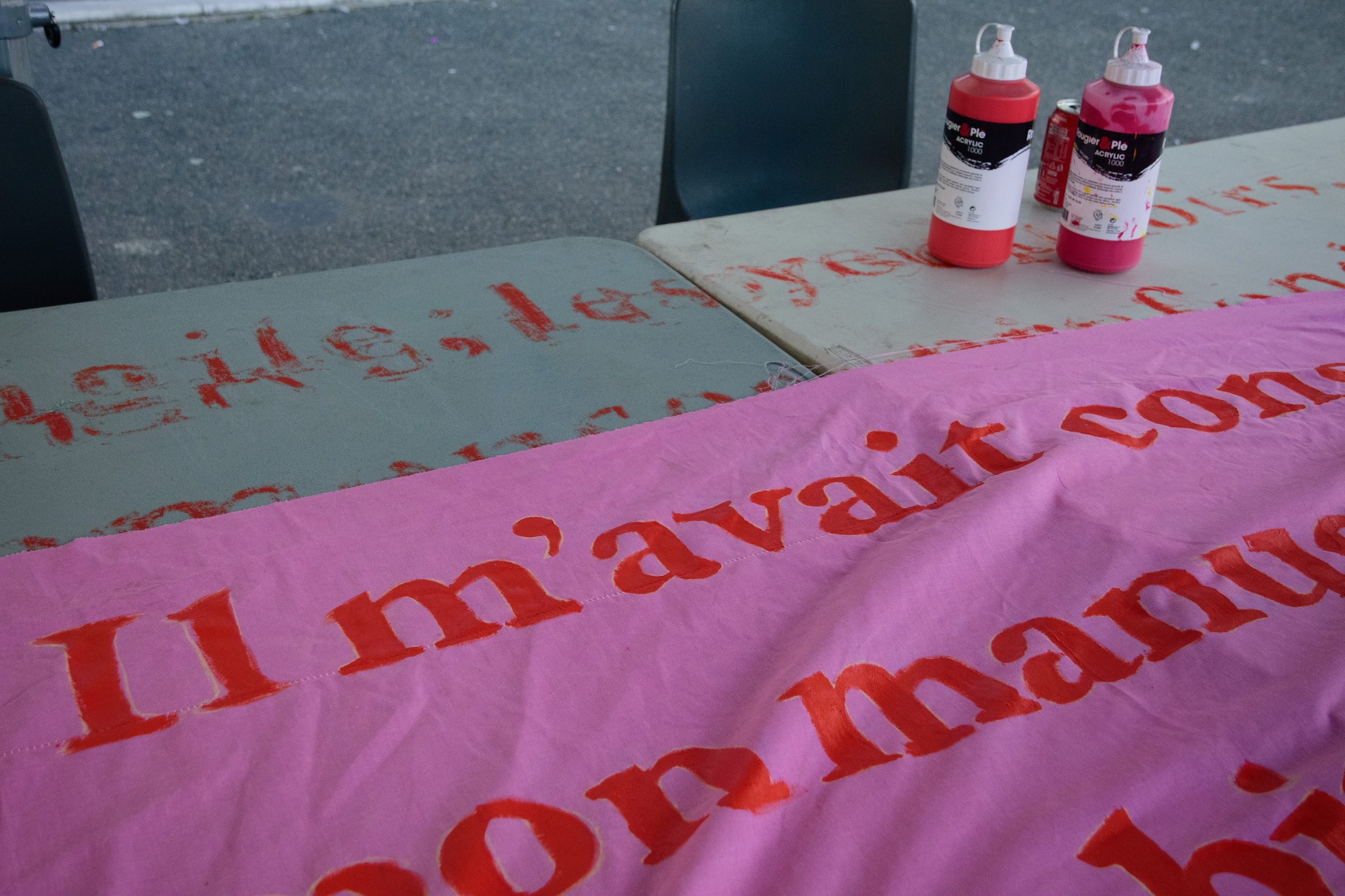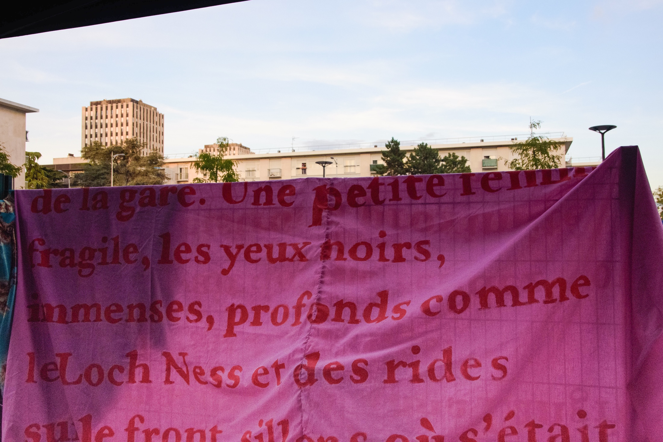 Les fruits de ces ateliers pouvaient parfois sembler modestes. Se négociait entre « experts du terrain » durant des heures, le choix de certains mots à inscrire sur les tissus dans des langues que nous ne maîtrisions pas. Le temps passait et nous risquions, malgré ces riches échanges, de ne pas vraiment aboutir à une production réelle. De même, bien que les différentes institutions partenaires soient de grande qualité, nous constations que certains habitants du quartier ne fréquentaient pas ces lieux. Il fallait adapter notre approche et nous situer à proximité plus immédiate de notre périmètre d’intervention : notre attention se porta alors sur cet immeuble de dix étages, quatre cages d’escalier et 80 appartements face à la place André Gide.